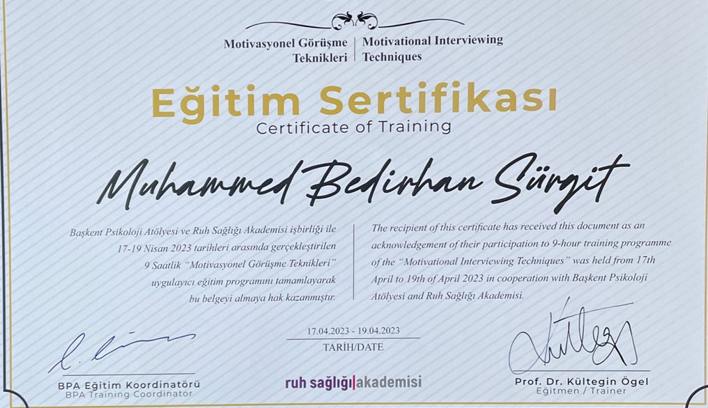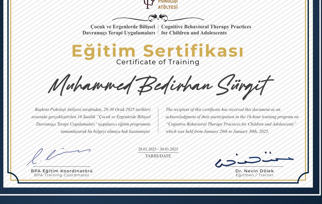 Askerlik sürecinde yaşadığım problemler ve ortaya çıkan panik ataklar nedeniyle Bedirhan Hoca’yla görüşmeye başladım. Kendisinin anlayışlı ve profesyonel yaklaşımı sayesinde yalnızca bu zorlayıcı süreçle başa çıkmayı değil, aynı zamanda bu yaşantıların temelinde yatan derin sorunları da fark etmeyi başardım. Bu farkındalık, kendimi tanımamı ve yaşadıklarımı kabullenerek hayatıma daha güçlü bir şekilde devam etmemi sağladı.