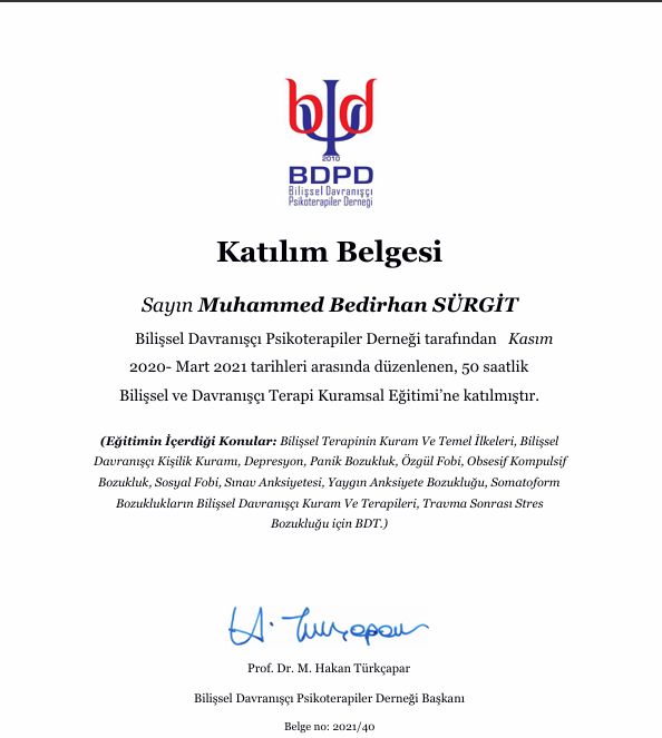 Bedirhan Bey’le hayatımın en depresif ve anlam karmaşası yaşadığım bir dönemde tanıştım. Üstelik terapi süreçlerine ön yargılı olan biri olarak hayatıma kazandırdığı farklı bakış açıları, yaşanan durumları nasıl ele almam konusunda yoluma ışık oldu. Kendisinin sayesinde hem ön yargılarım yıkıldı hem de terapi sürecinde durumları benim fark etmem ve müdahale etmeme yardımcı oldu. Bahsettiğim durumlar basit görünse de aslında hayata bakış açımı değiştiren unsurlar. Kendisi çok donanımlı. Bu nedenle benim için terapi süreci oldukça faydalı oldu.